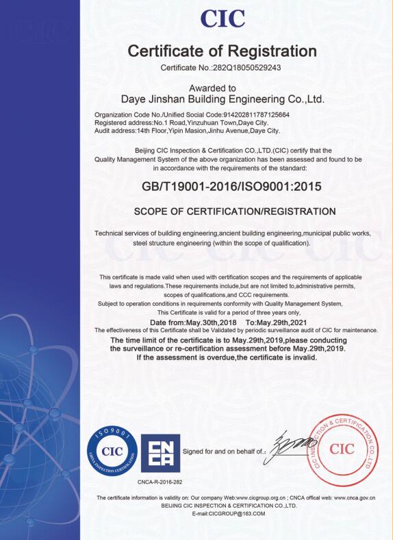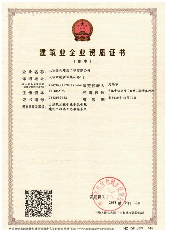 大冶金山建筑工程有限公司始建于1984年,屬鎮(zhèn)辦集體企業(yè)。1997年改制為大冶山建筑工程有限責(zé)任公司,屬股份制企業(yè)。2013年更名為大冶金山建筑工程有限公司,2018年3月公司資源重組,公司注冊資金達(dá)到10180.00萬元,公司法定代表人為劉瑞華。公司具有古建筑工程專業(yè)承包壹級、建筑工程施工總承包貳級、市政工程總承包叁級、鋼結(jié)構(gòu)工程專業(yè)承包叁級資質(zhì)。